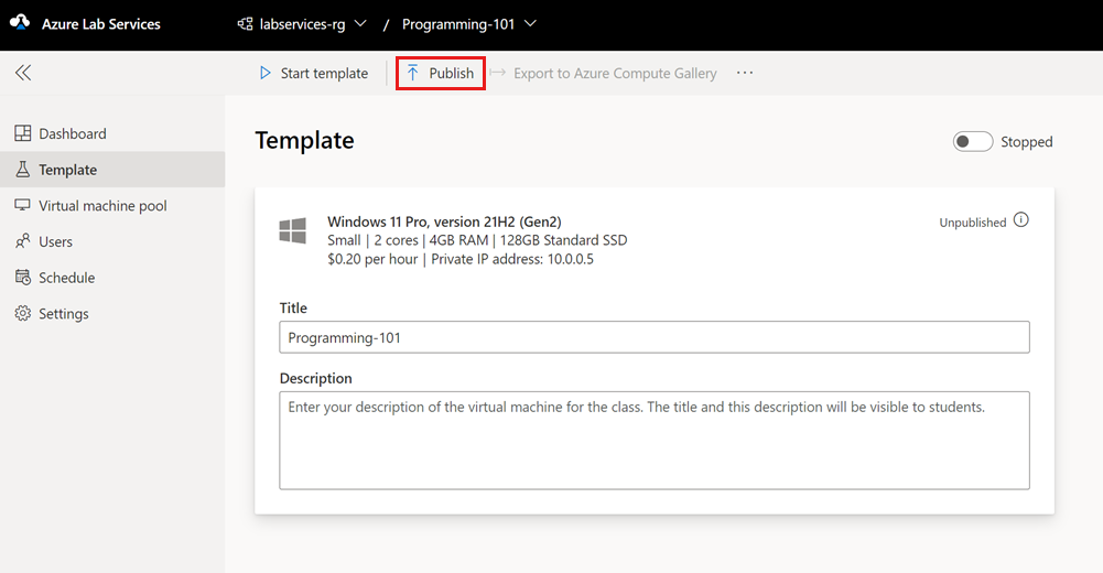 - Publish the lab to create lab VMs
