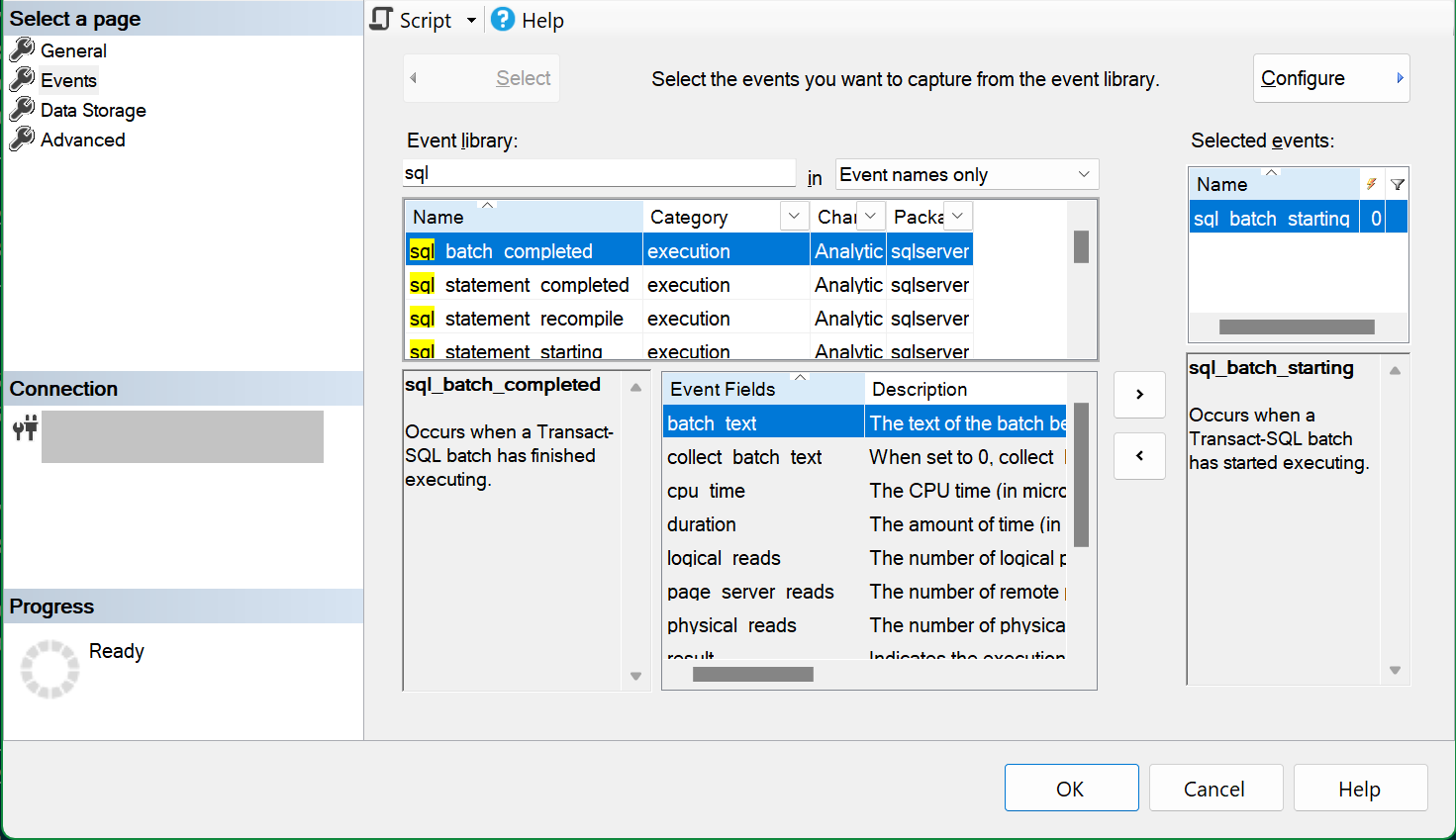 filenameargument, similar to the SQL Managed Instance example below, and execute the script to create the session.Now that the session is configured, you can select the Script button to create a T-SQL script of the session, to save it for later. Here's the script for our example session: