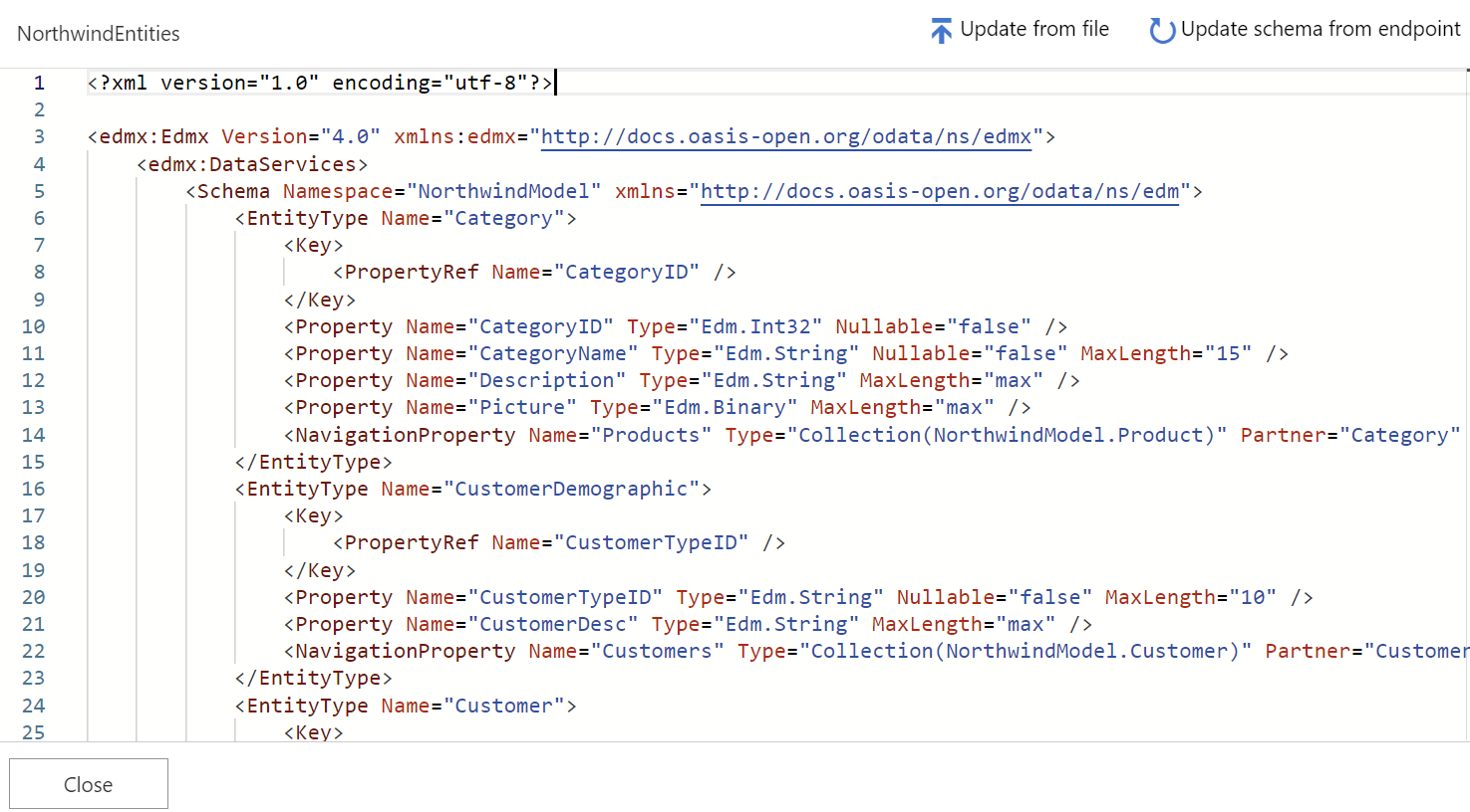 You can access an editor in the portal to view your API's OData schema. If the API changes, you can also update the schema in API Management from a file or an OData service endpoint.