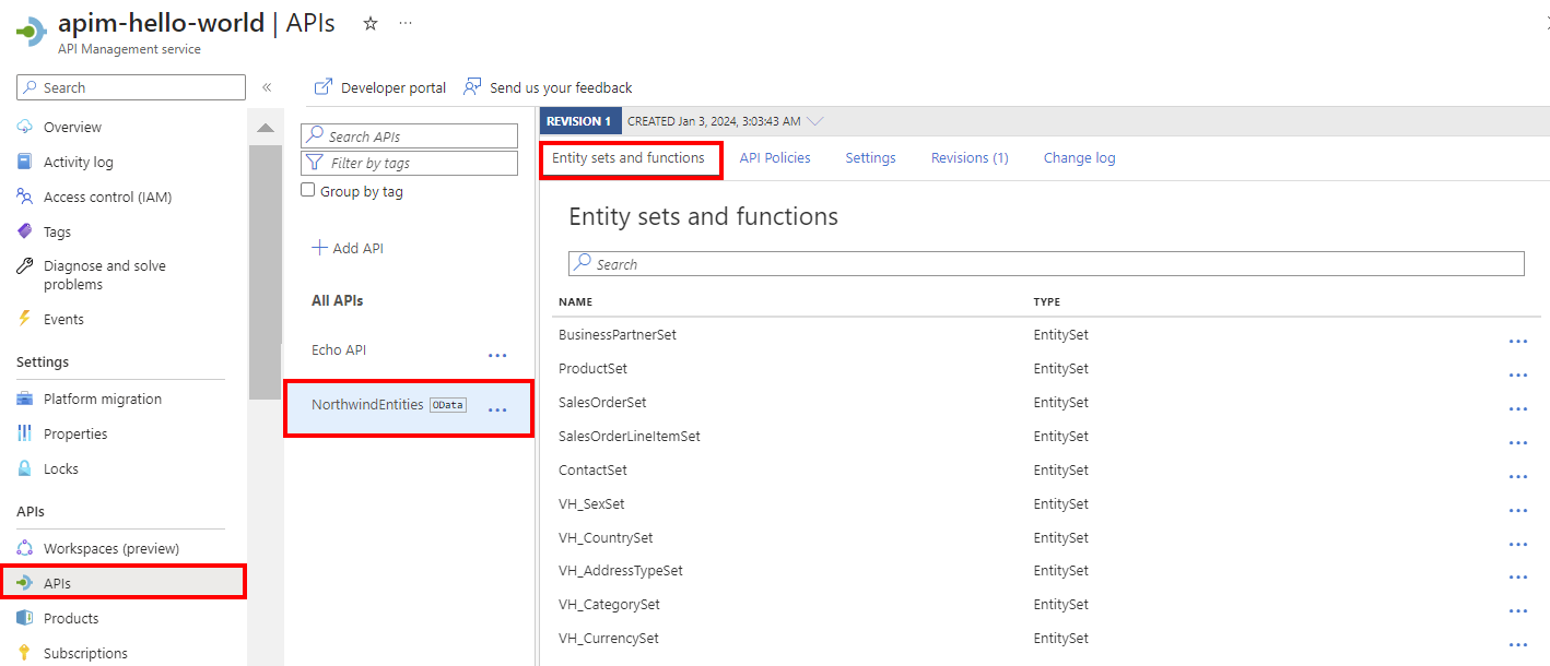The API is added to the list of APIs. The entity sets and functions that are exposed in the OData metadata description appear on the API's Entity sets and functions tab.