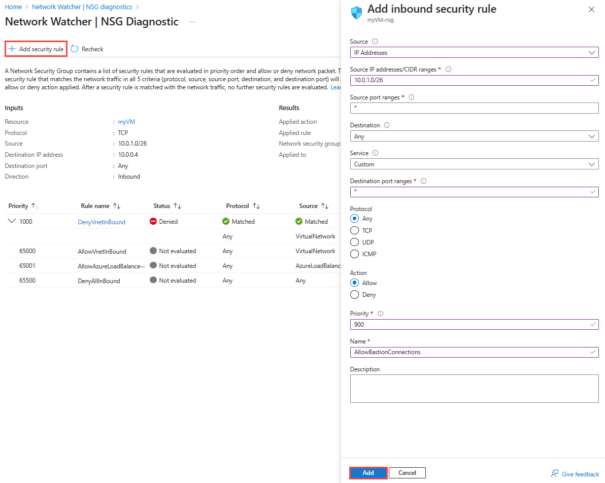 1. To add the security rule from within Network Watcher, select + Add security rule, and then enter or select the following values:
