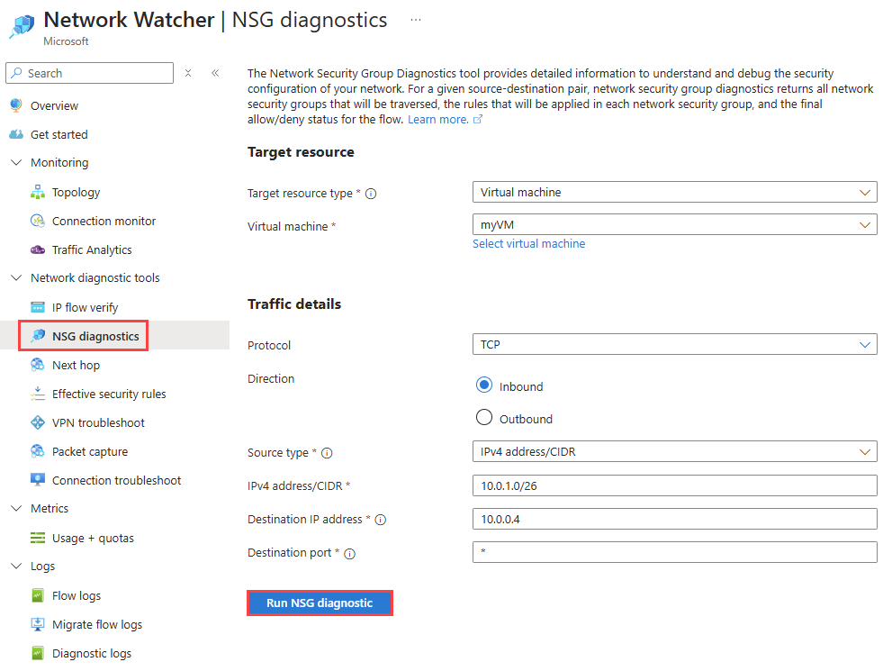 3. On the NSG diagnostics page, enter or select the following values: