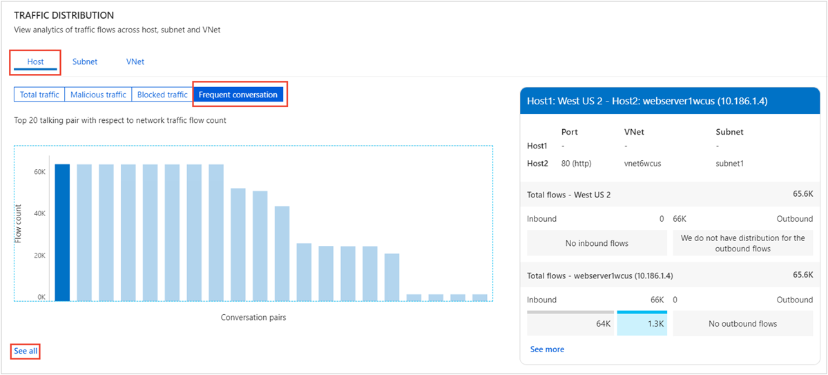- Check comparative chart for hosts, subnet, virtual network, and virtual machine scale set. Understanding, which hosts, subnets, virtual networks and virtual machine scale set are sending or receiving the most traffic can help you identify the hosts that are processing the most traffic, and whether the traffic distribution is done properly.