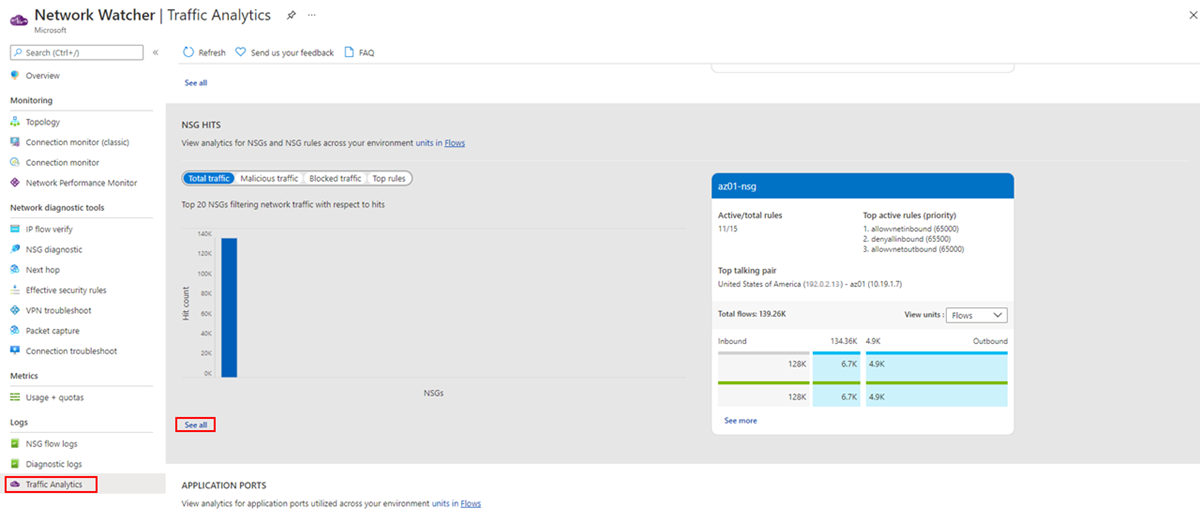 Are the applications configured properly? Are they using the appropriate protocol for communication? Expected behavior is common ports such as 80 and 443. For standard communication, if any unusual ports are displayed, they might require a configuration change. Select See all under Application port, in the following image: