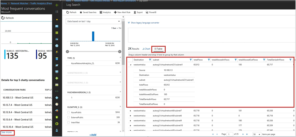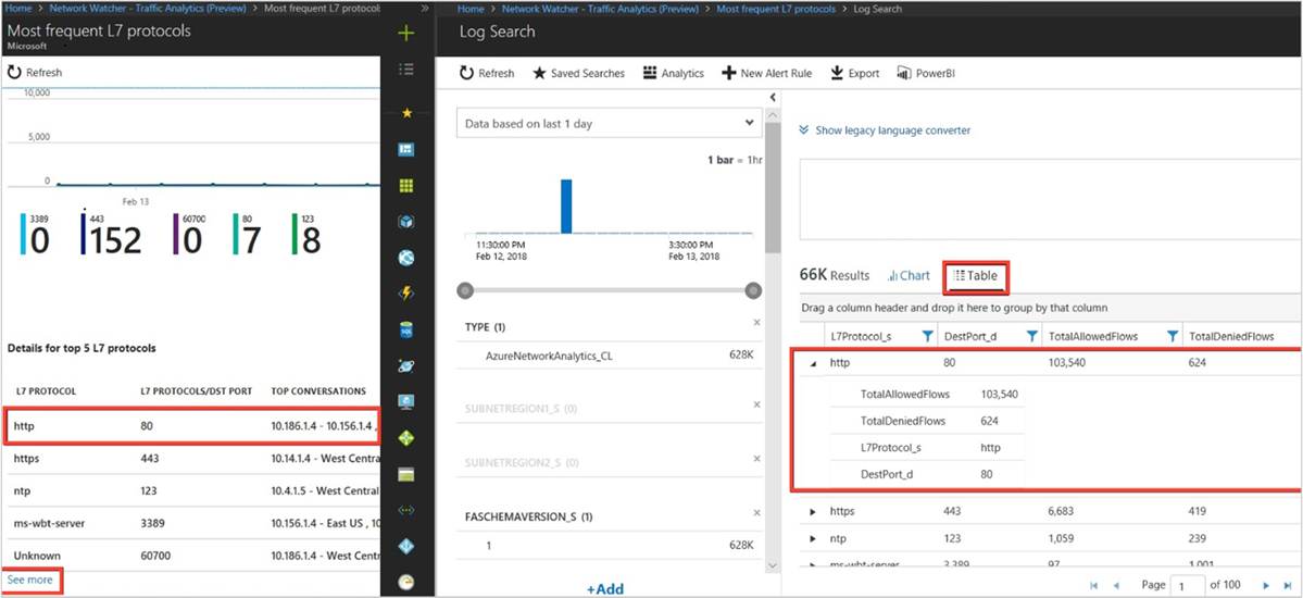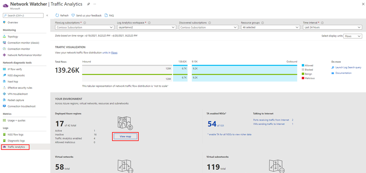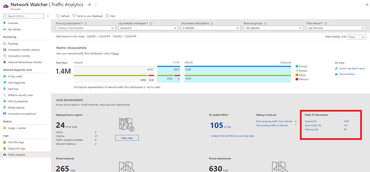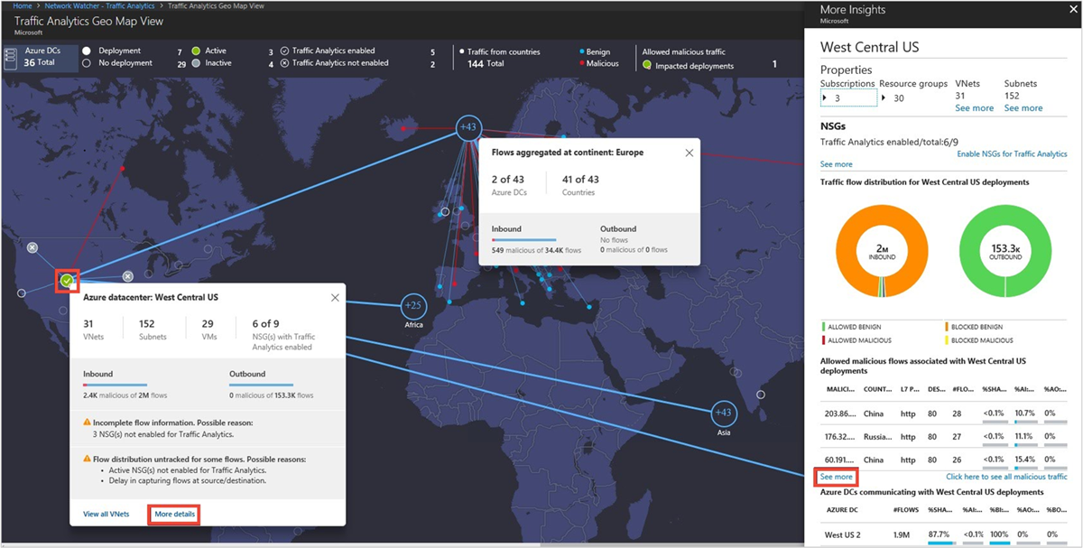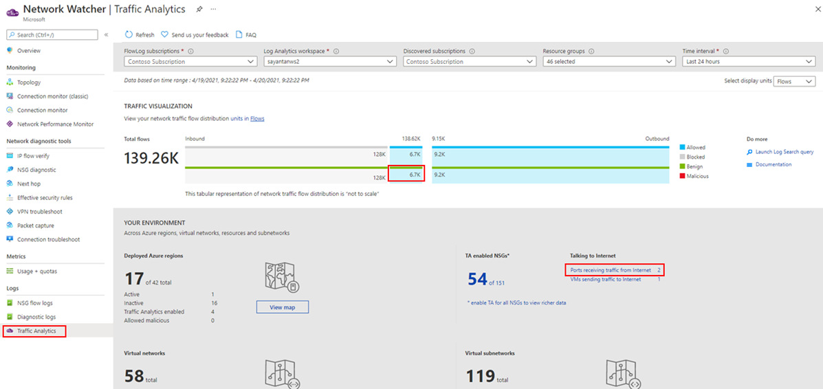 - Which hosts, subnets, virtual networks, and virtual machine scale set are sending or receiving the most traffic, traversing maximum malicious traffic and blocking significant flows?