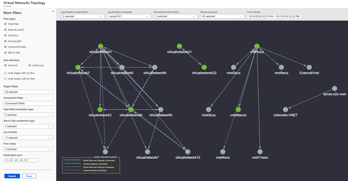 You can filter the Virtual Network Topology based on subscriptions, workspaces, resource groups and time interval. Extra filters that help you understand the flow are: Flow Type (InterVNet, IntraVNET, and so on), Flow Direction (Inbound, Outbound), Flow Status (Allowed, Blocked), VNETs (Targeted and Connected), Connection Type (Peering or Gateway - P2S and S2S), and NSG. Use these filters to focus on VNets that you want to examine in detail.