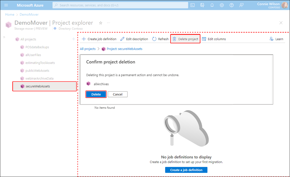 The removal of a project resource should be a relatively rare occurrence in your production environment, though there may be occasions where it may be helpful. To delete a Storage Mover project resource, follow the provided example.