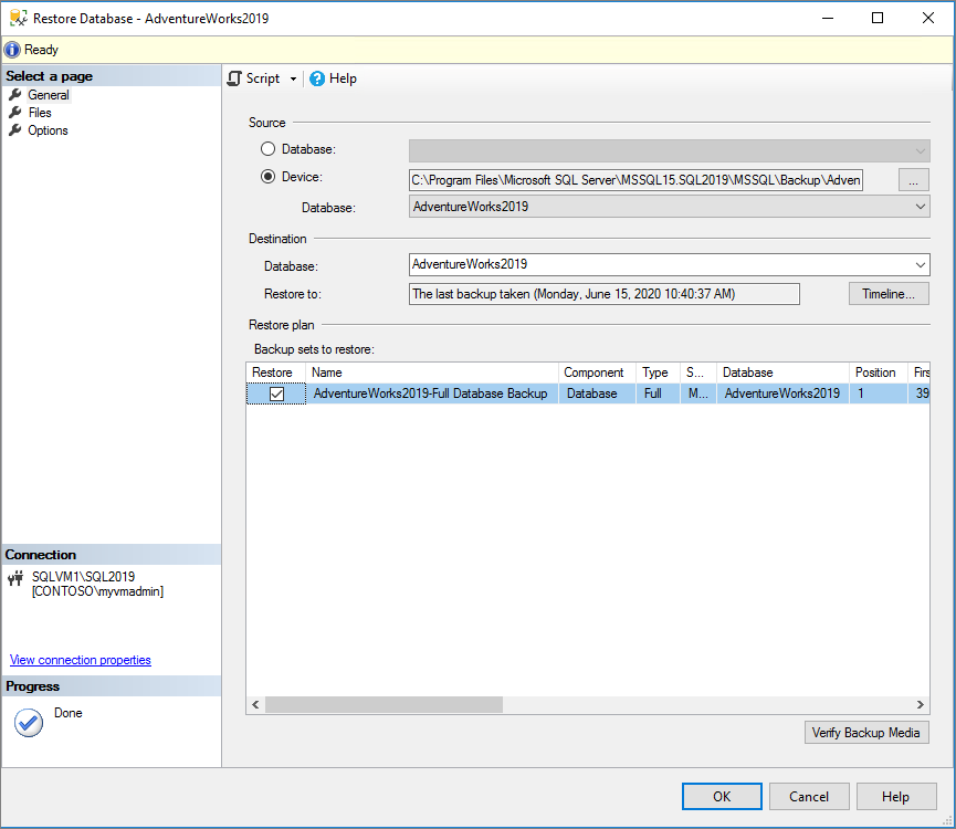 Check the Files tab to confirm that the Restore as location and file names match your intended location and file names in the Restore Database wizard.