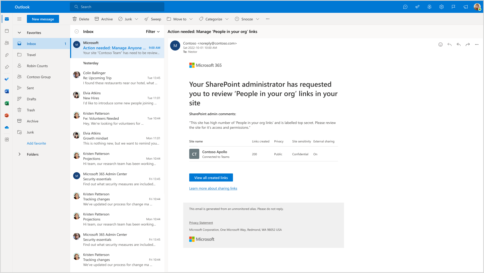 - When a review is initiated, the site owner receives an email tailored to the specific oversharing issue identified in the selected report. For example, if the review is for the "Content shared with 'Everyone except external users'" category, the email will focus only on sharing concerns related to that report.