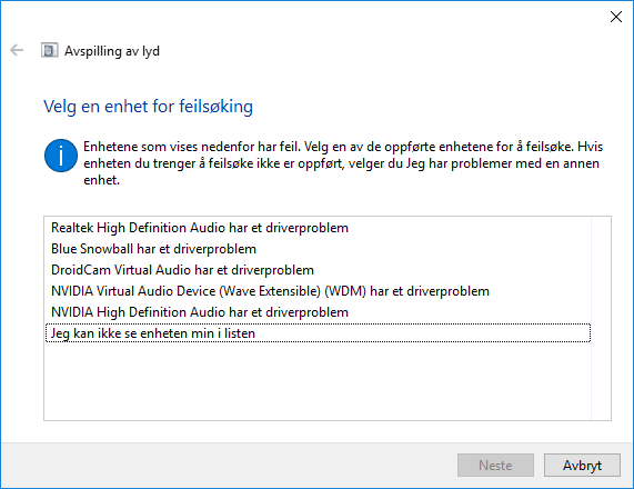 Windows kan ikke finne avspillingsenheter etter oppdatering