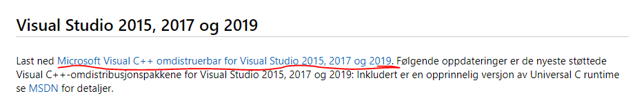 Du kan fremdeles skaffe en original kopi av dem gjennom manuelle nedlastinger fra dette nettstedet:De nyeste støttede Visual C ++ - nedlastningene.