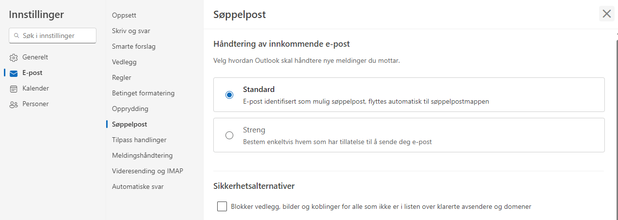 Du kan sjekke om du har satt behandlingen av innkommende e-poster til "Streng" før, for hvis du gjør det, kan det hende du bare mottar e-post fra sikre avsendere, og dermed går glipp av noen viktige e-poster. Så du kan prøve å sette den til 'Standard'.