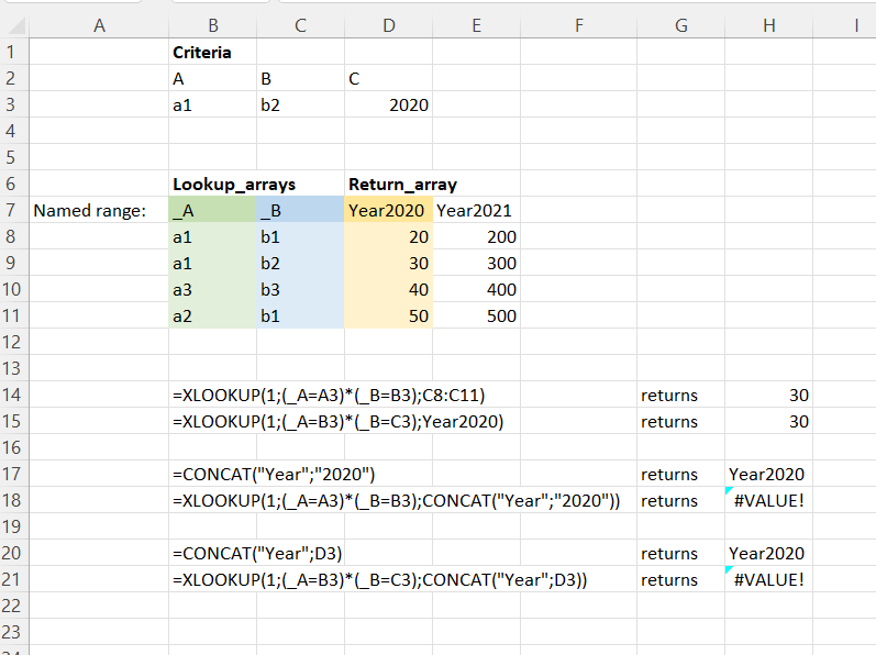 under har jeg limt inn et bilde av et eksempel på hva jeg vil gjøre. De fargede feltene er named ranges, med navnet øverst i mørkere farge. Ideen er at XLOOKUP skal lese et sett kriterier fra en tabell (her cellene B3-D3), og finne verdien i en annen tabell (cellene B8-E11). Ranges _A og _B inneholder oppslagskriteriene, ranges Year2020 og Year2021 er verdier som skal kunne vises som resultat av XLOOKUP. I celle D3 skal jeg kunne angi om jeg vil ha en verdi fra range Year2020 eller Year2021.