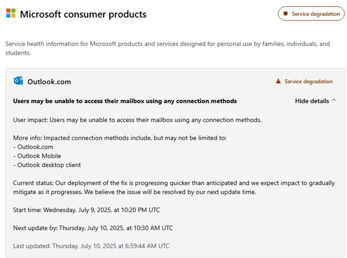 Microsoft-teknikere har bekreftet et pågående tjenesteavbrudd som påvirker alle tilgangsmetoder, inkludert: