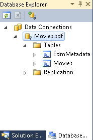 Double-click Movies.sdf to open Server Explorer. Then expand the Tables folder to see the tables that have been created in the database.