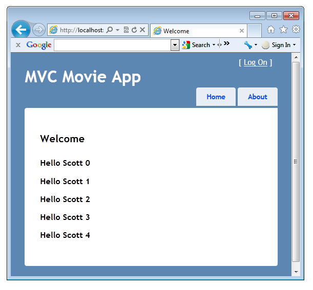 Run the application and browse to http://localhost:xx/HelloWorld/Welcome?name=Scott&numtimes=4