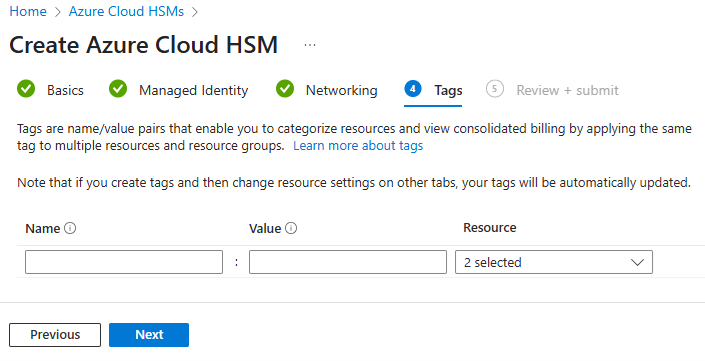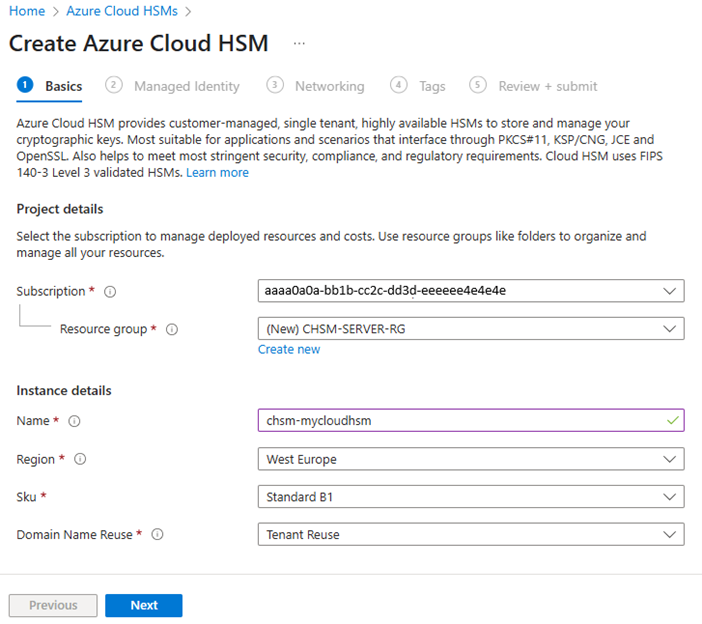 Specify the HSM Name, Region, and Sku (product tier) values.