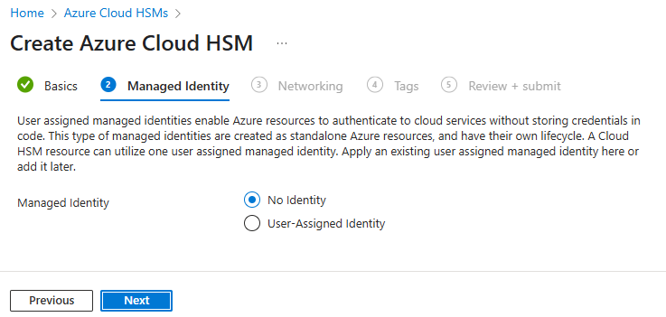 By default, Azure Cloud HSM is set to No Identity because it primarily uses password-based authentication with user management handled directly on the HSM. However, for backup and restore operations, you need a managed identity.