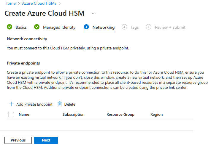 If you don't have a virtual network and subnet ready, you can still create the HSM first and add network connectivity later. We strongly recommend that you use private endpoints for production environments, as described in Network security for Azure Cloud HSM.