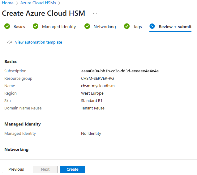 Review all HSM details, including managed identity and network settings.