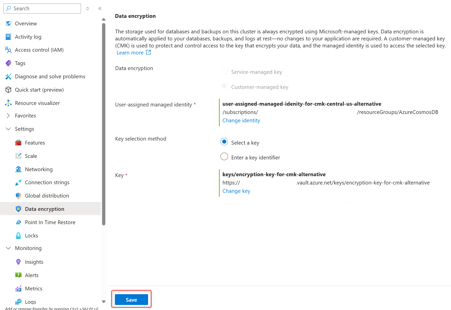 Confirm selected user-assigned managed identity and encryption key on the Data encryption page and select Save to confirm your selections and create replica cluster.