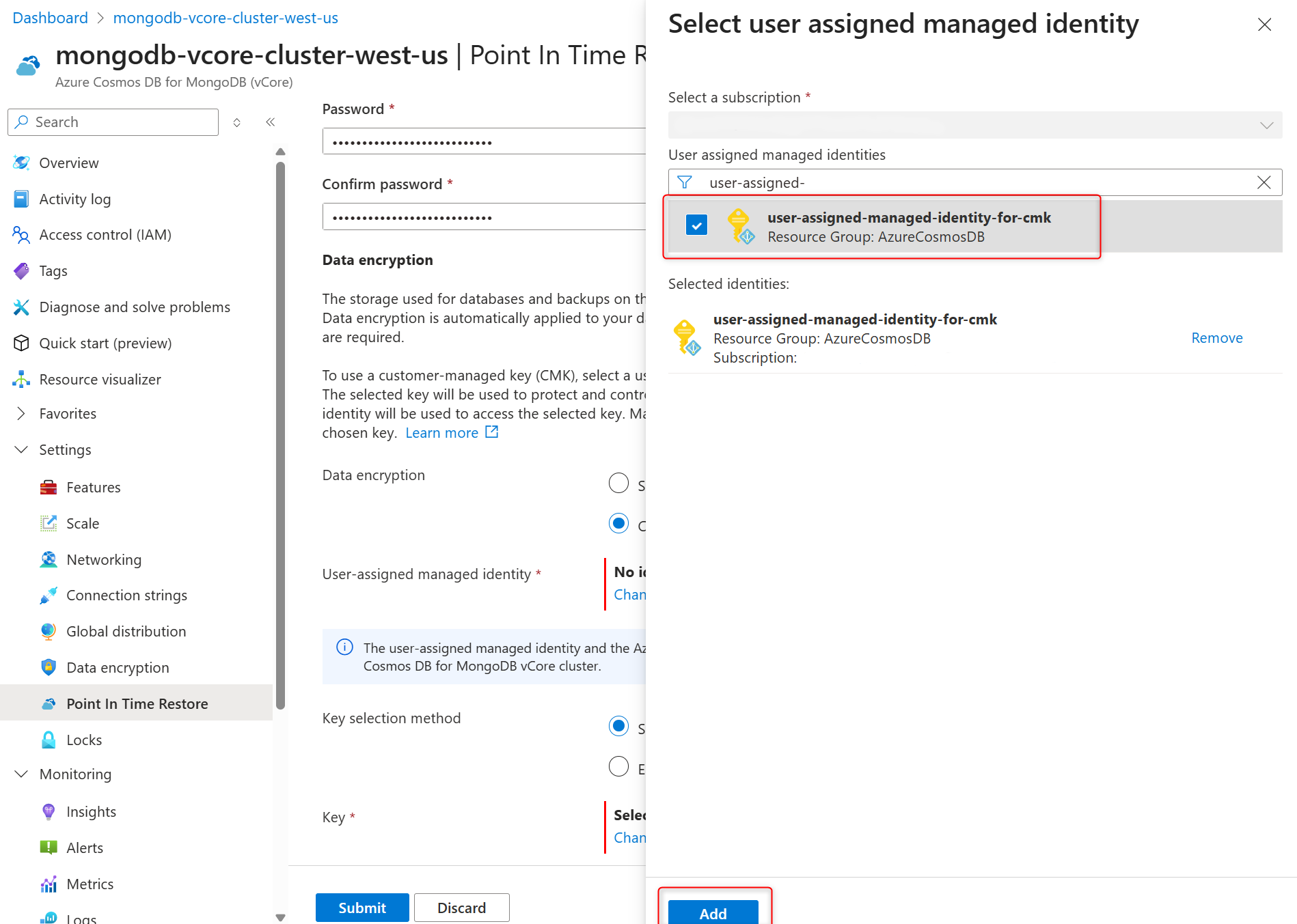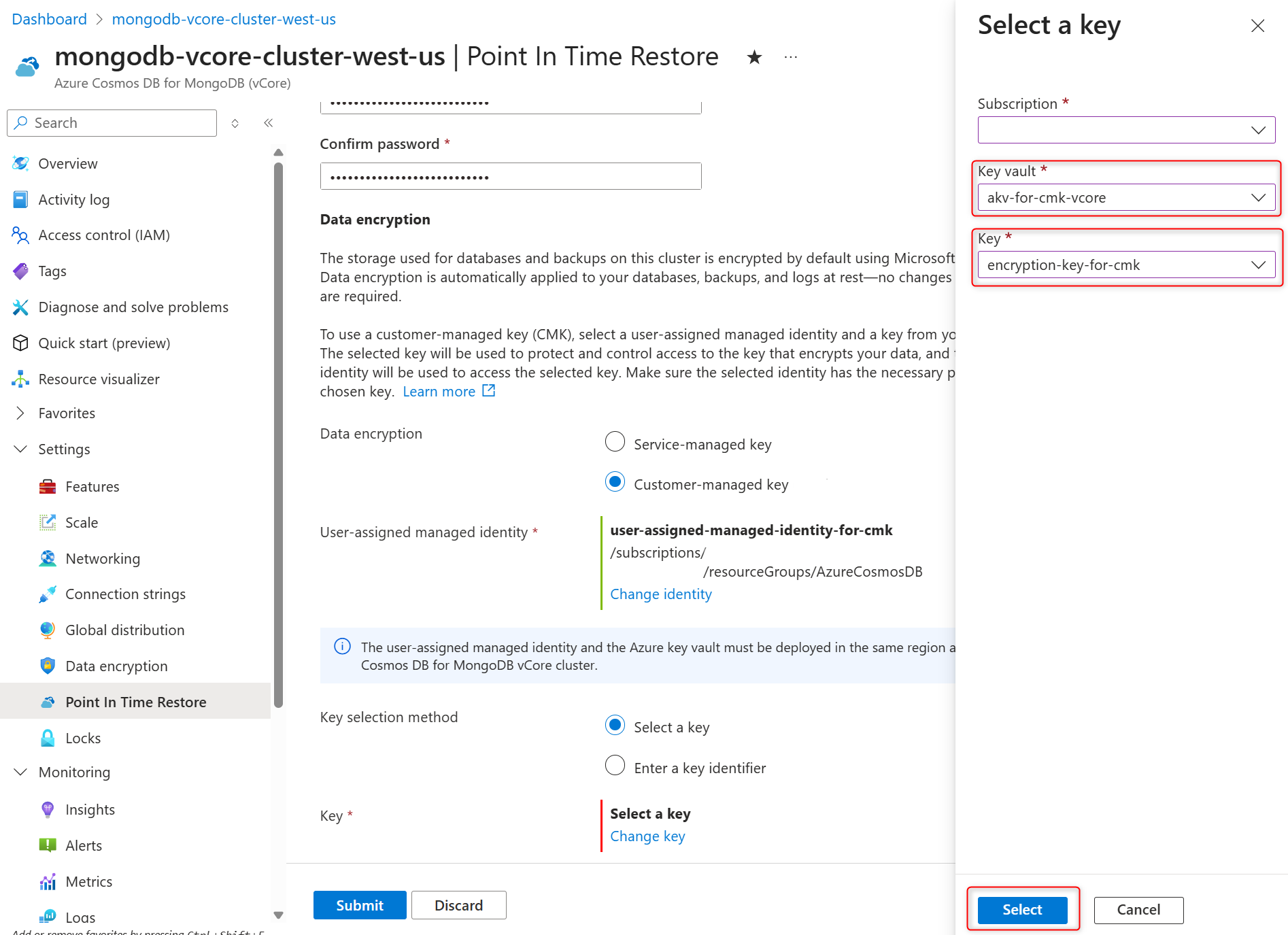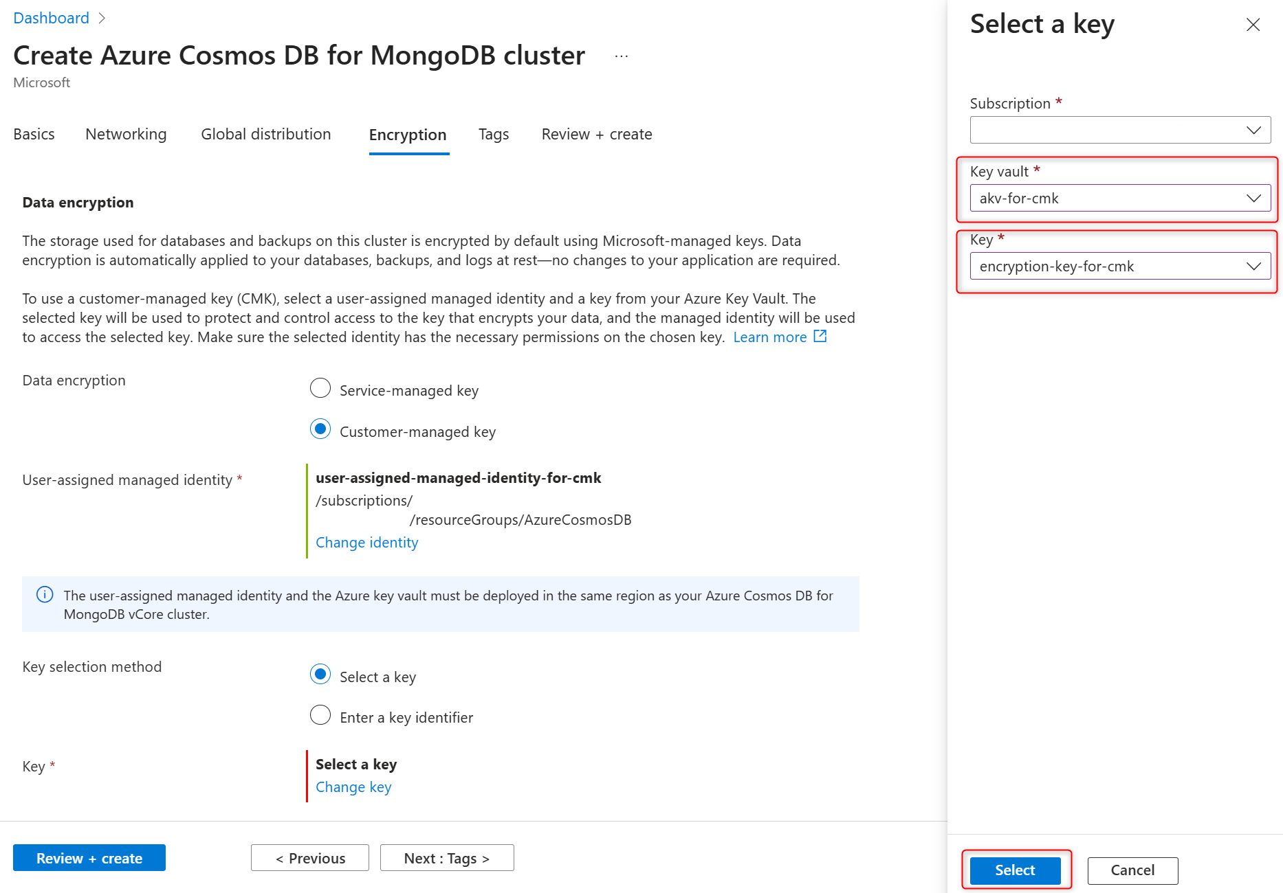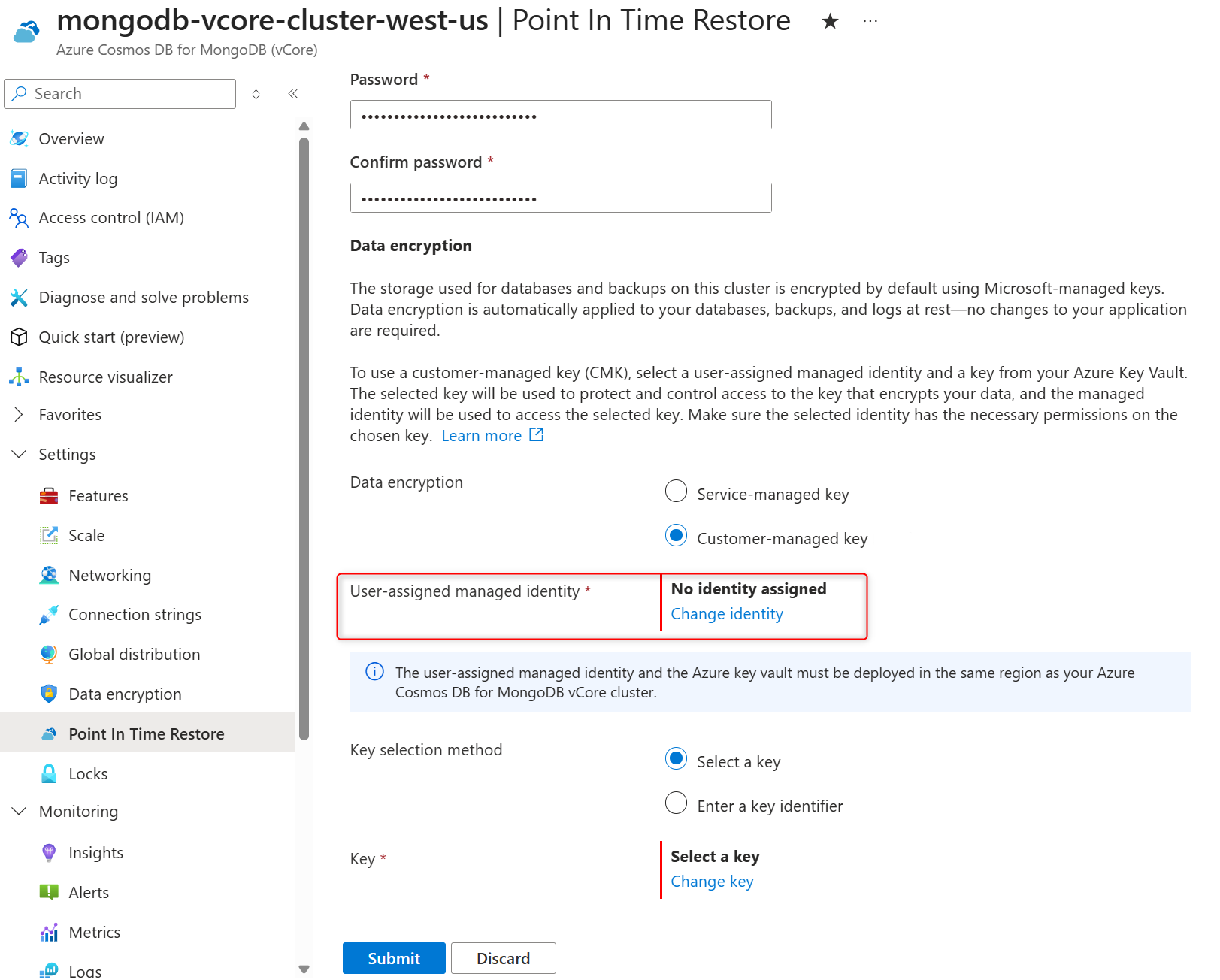 User-assigned managed identity and Azure Key Vault instance used to configure CMK should be in the same Azure region where Azure DocumentDB cluster is hosted and all belong to the same Microsoft tenant.