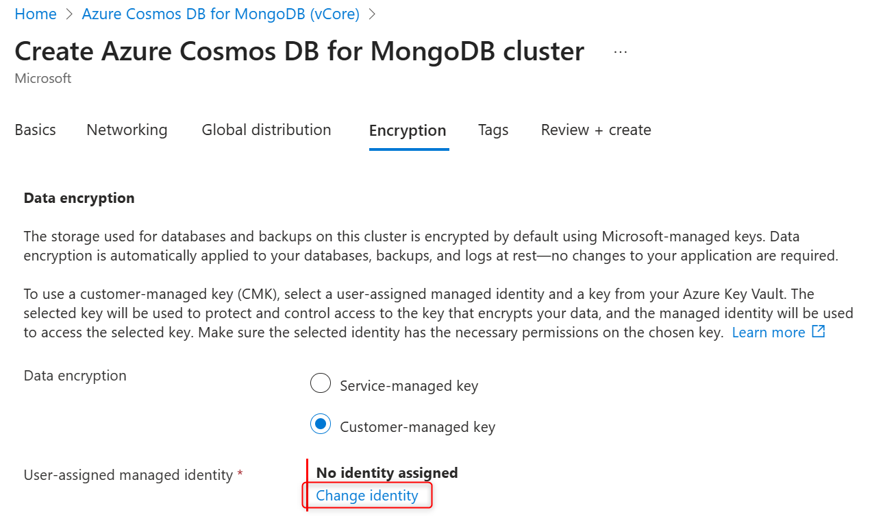The only point at which you can decide if you want to use a service-managed key or a customer-managed key (CMK) for data encryption, is at cluster creation time. Once you make that decision and create the cluster, you can't switch between the two options. To create a copy of your Azure DocumentDB cluster with a different encryption option, you can either create a replica cluster or perform a cluster restore and select the new encryption mode during replica cluster or restored cluster creation.