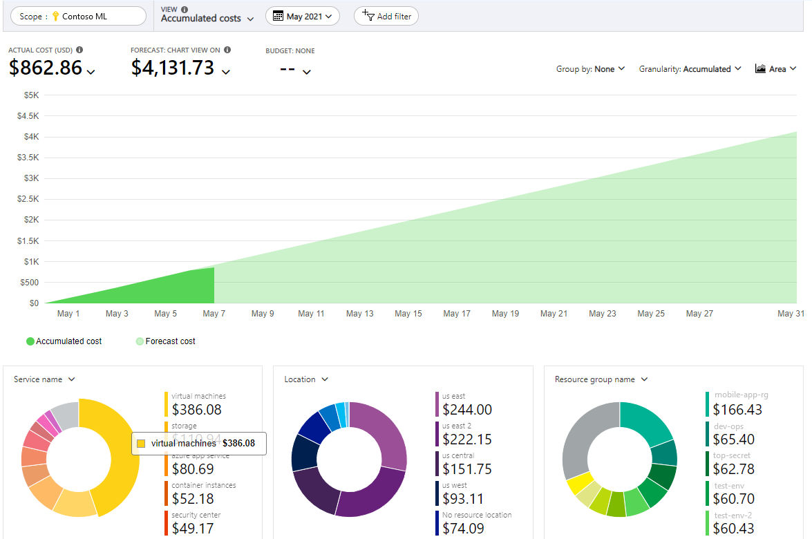 When you use cost analysis, you view Azure Machine Learning costs in graphs and tables for different time intervals. Some examples are by day, current and prior month, and year. You also view costs against budgets and forecasted costs. Switching to longer views over time can help you identify spending trends. And you see where overspending might have occurred. If you create budgets, you can also easily see where they're exceeded.