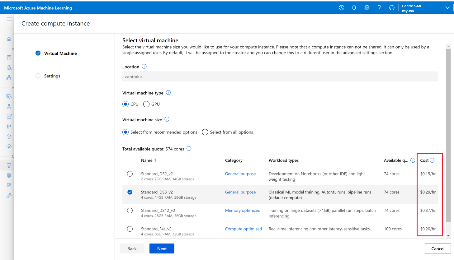 As you create compute resources for Azure Machine Learning, you see estimated costs.