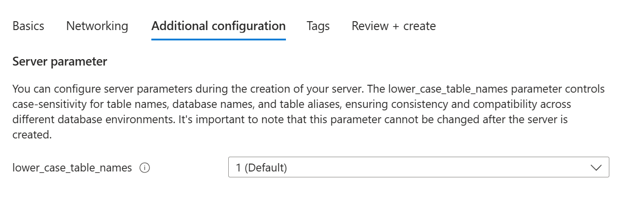 For MySQL version 8.0+ you can configure lower_case_table_names only when you're initializing the server. Learn more. Changing the lower_case_table_names setting after the server is initialized is prohibited. Supported values for MySQL version 8.0 are 1 and 2 in Azure Database for MySQL - Flexible Server. The default value is 1.
