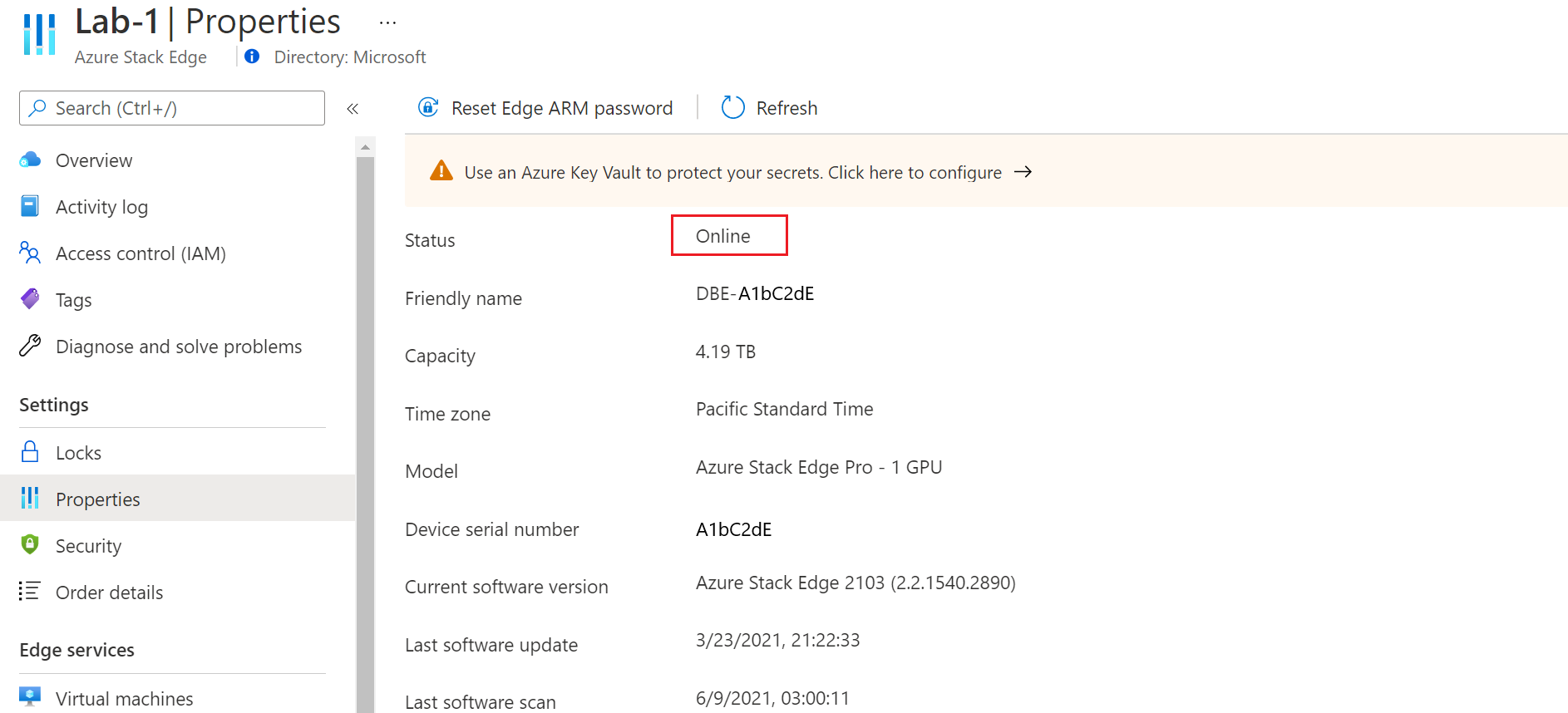 Verify that the device Status, located in the properties section for the Azure Stack Edge resource in the Azure management portal, is Online.