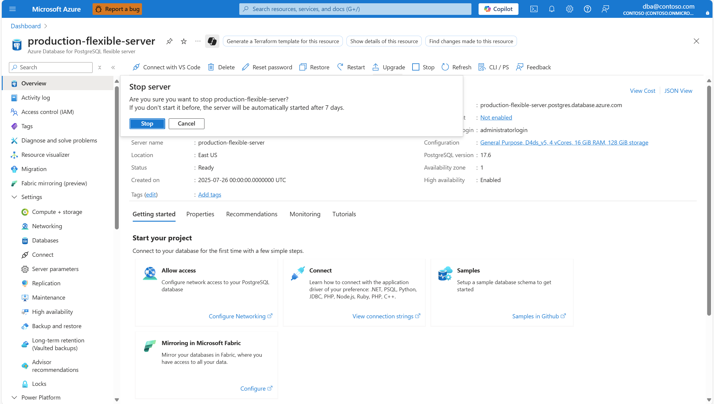 Once the server is stopped, other management operations aren't available for the Azure Database for PostgreSQL flexible server. While the Azure Database for PostgreSQL flexible server is in stopped state, it could be briefly restarted for scheduled monthly maintenance, and then returned to its stopped state. This procedure ensures that even instances in a stopped state, stay up to date with all necessary patches and updates.