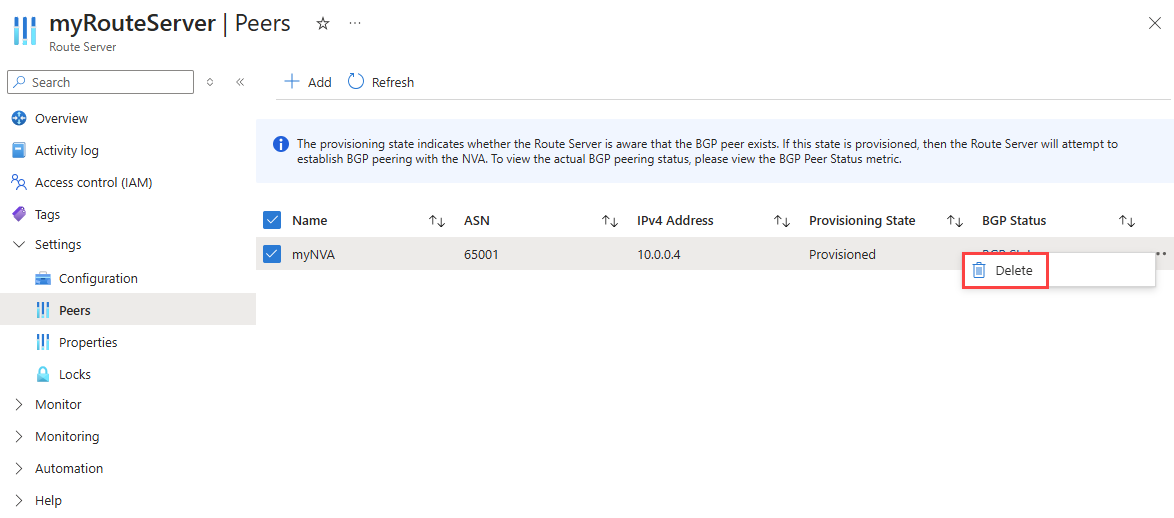 In this section, you learn how to delete an existing BGP peering between your route server and a network virtual appliance (NVA). This removes the BGP session and stops route exchange between the devices.
