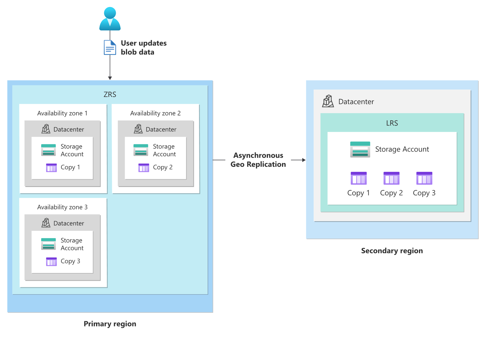 When a storage account is configured for geo-zone-redundant storage (GZRS) or read access geo-zone-redundant storage (RA-GZRS) replication, data is zone-redundant within the zone redundant storage (ZRS) primary region and replicated three times within the LRS secondary region. If the account is configured for read access (RA), you're able to read data from the secondary region as long as the storage service endpoints to that region are available.