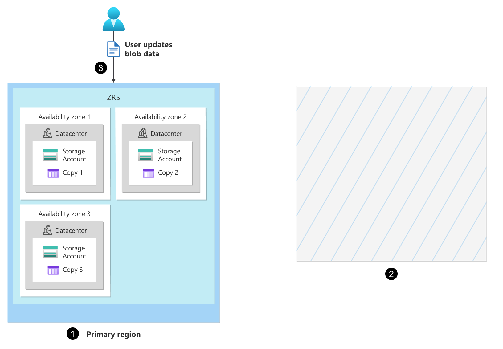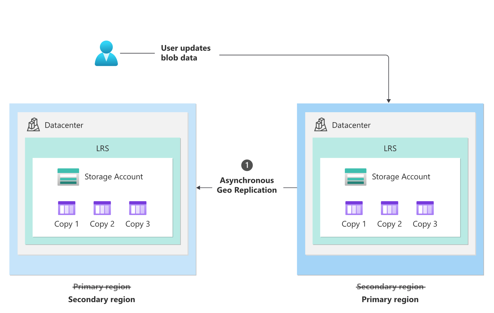 Under normal circumstances, a client writes data to a storage account in the primary region via storage service endpoints (1). The data is then copied asynchronously from the primary region to the secondary region (2). The following image shows the normal state of a storage account configured as GRS when the primary endpoints are available: