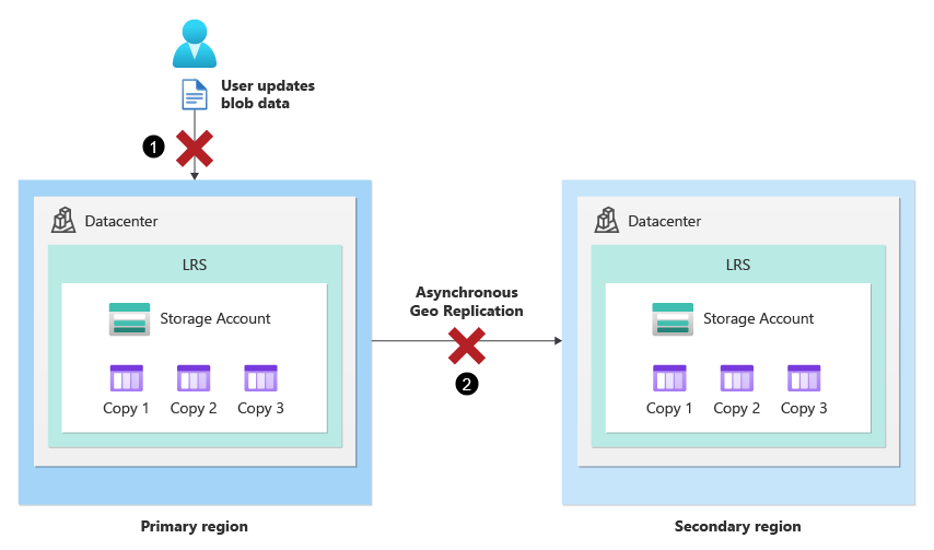 If the primary storage service endpoints become unavailable for any reason (1), the client is no longer able to write to the storage account. Depending on the underlying cause of the outage, replication to the secondary region might no longer be functioning (2), so some data loss should be expected. The following image shows the scenario where the primary endpoints become unavailable, but before recovery occurs: