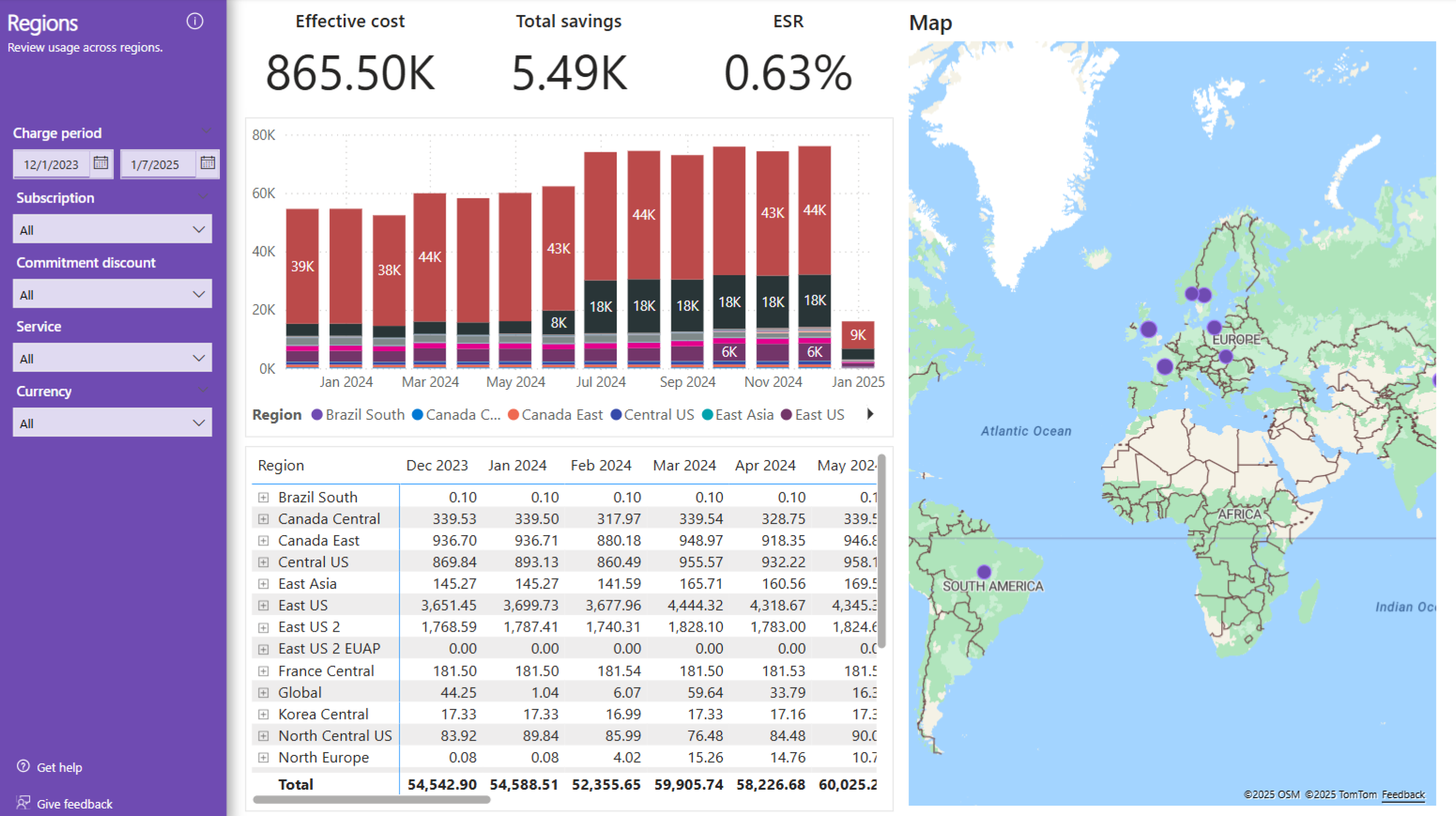 The Regions page includes a breakdown of cost by region with a map showing the cost from each region. The map shows approximate locations and isn't exact.