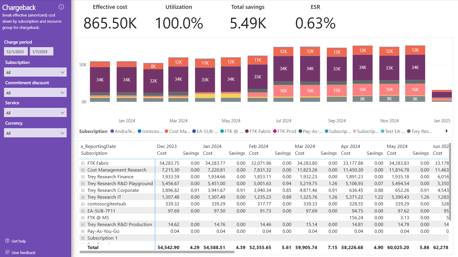 The chart shows the amortized cost for each subscription that used a commitment. If you see Unassigned, that is the unused cost that isn't associated with a subscription.