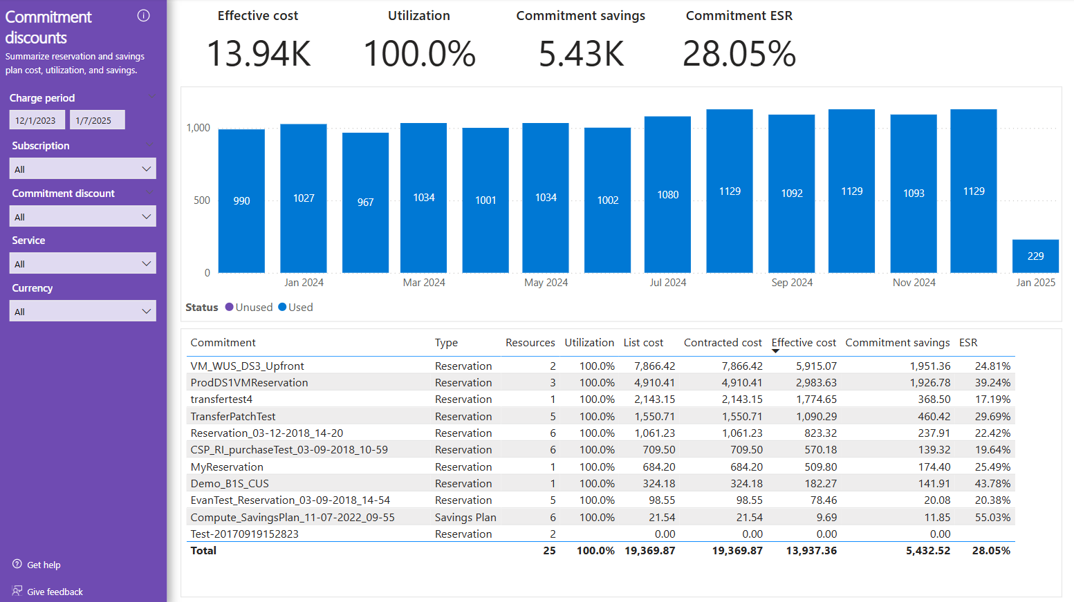 The Commitment discounts page provides a list of your commitment discounts and offers a summary of the quantity used, utilization, savings, and effective cost for the period.