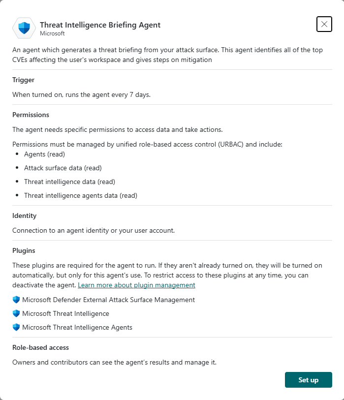 Choose the Threat Intelligence Briefing Agent and select Set up.
