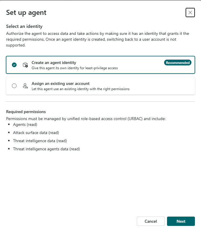 Identity and permissions requirement: This agent requires connection to an existing user account or creation of a new agent identity(recommended). The agent can read data from Defender External Attack Surface Management and Defender Vulnerability Management. You must configure the user account with the appropriate permissions outlined in the following section before setting up the agent.