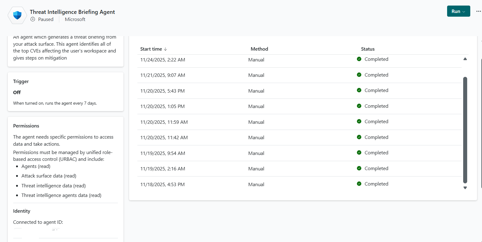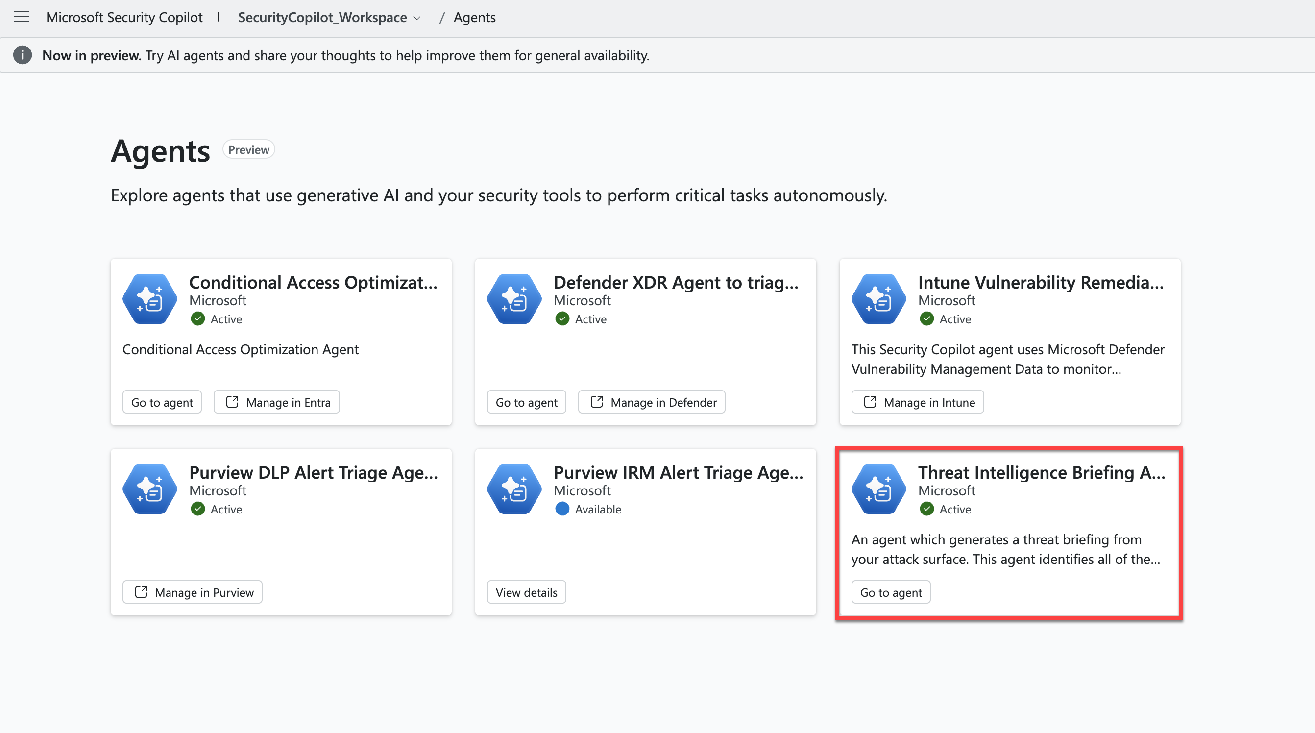 To run the Threat Intelligence Briefing Agent, go to the Agents page in the Microsoft Security Copilot standalone portal.