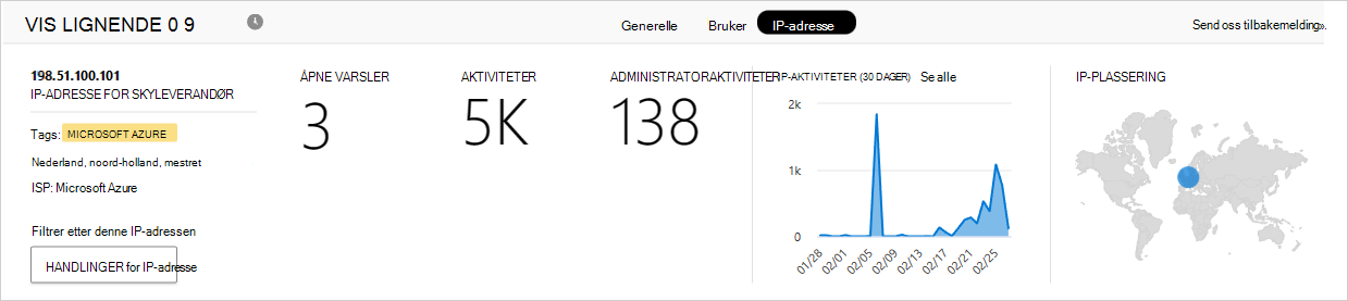 Siden IP-adresseinformasjon er avgjørende for nesten alle undersøkelser, kan du vise detaljert informasjon om IP-adresser i aktivitetsskuffen. Fra en bestemt aktivitet kan du velge IP-adressefanen for å vise konsoliderte data om IP-adressen, inkludert antall åpne varsler for den bestemte IP-adressen, en trendgraf over nylig aktivitet og et plasseringskart. Dette gjør det enkelt å drille ned når du for eksempel undersøker umulige reisevarsler. I tillegg kan du enkelt forstå hvor IP-adressen ble brukt, og om den var involvert i mistenkelige aktiviteter. Du kan også utføre handlinger direkte i IP-adresseskuffen som gjør det mulig å merke en IP-adresse som risikabelt, VPN eller firma for å lette fremtidig undersøkelse og opprettelse av policyer.