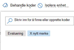 Legg til merker på enheter for å opprette en logisk gruppetilknytning. Enhetskoder støtter riktig tilordning av nettverket, slik at du kan legge ved ulike koder for å fange opp kontekst og aktivere dynamisk listeoppretting som en del av en hendelse. Merker kan brukes som et filter i enhetslagervisningen eller til å gruppere enheter. Hvis du vil ha mer informasjon om enhetsgruppering, kan du se Opprette og administrere enhetsgrupper.