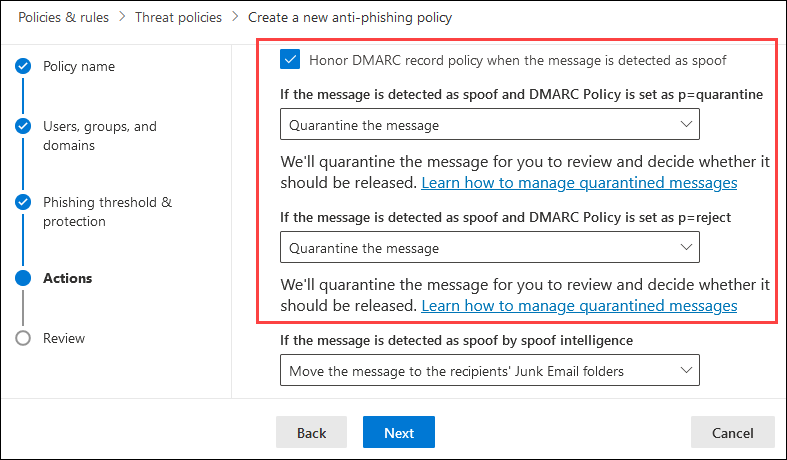 I policyer for anti-phishing kan du kontrollere om p=quarantine eller p=reject verdier i DMARC-policyer for avsender overholdes. Hvis en melding mislykkes med DMARC-kontroller, kan du angi separate handlinger for p=quarantine eller p=reject i avsenderens DMARC-policy. Følgende innstillinger er involvert:
