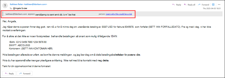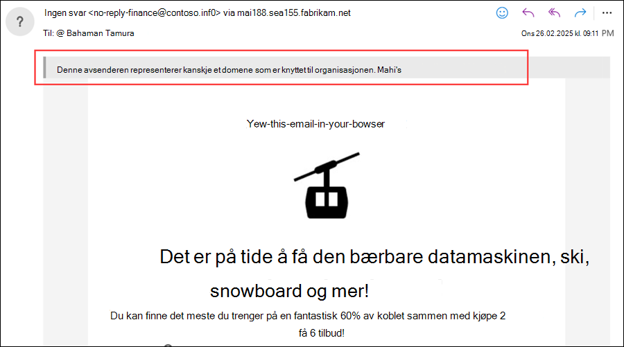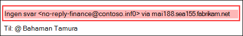 Vis sikkerhetstips for domenerepresentasjon: Fra-adressen inneholder et domene som er angitt i beskyttelse mot domenerepresentasjon. Bare tilgjengelig hvis Aktiver domener som skal beskyttes , er aktivert og konfigurert.