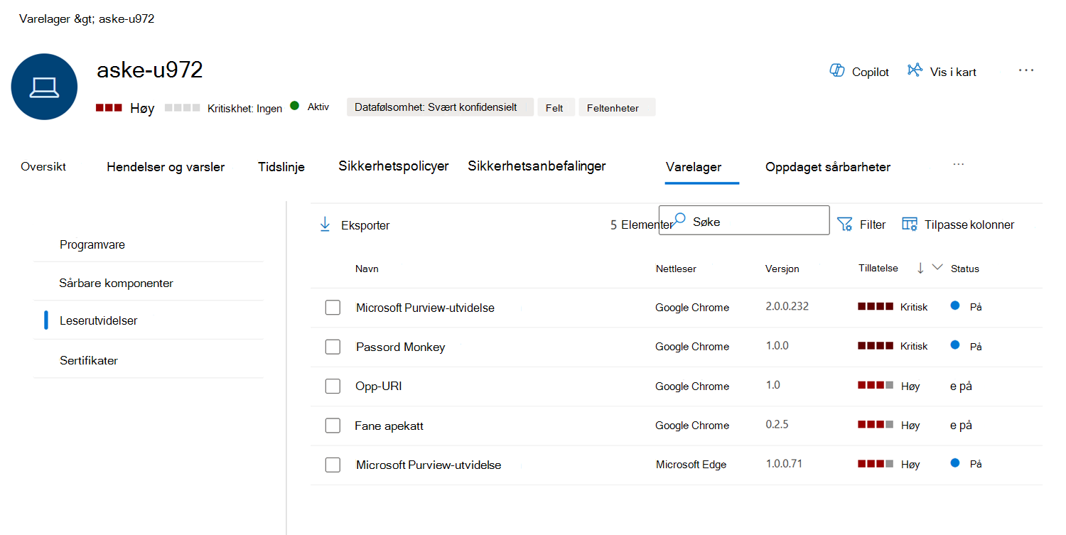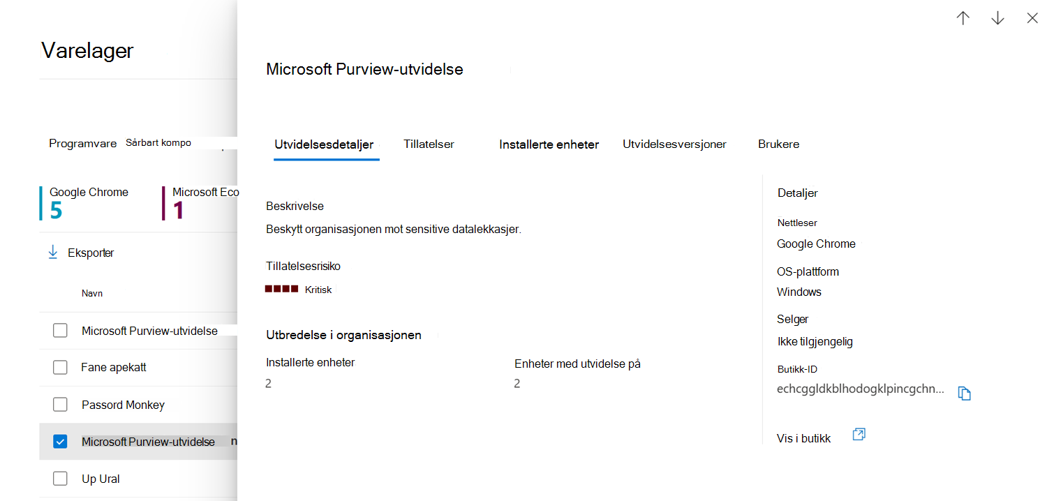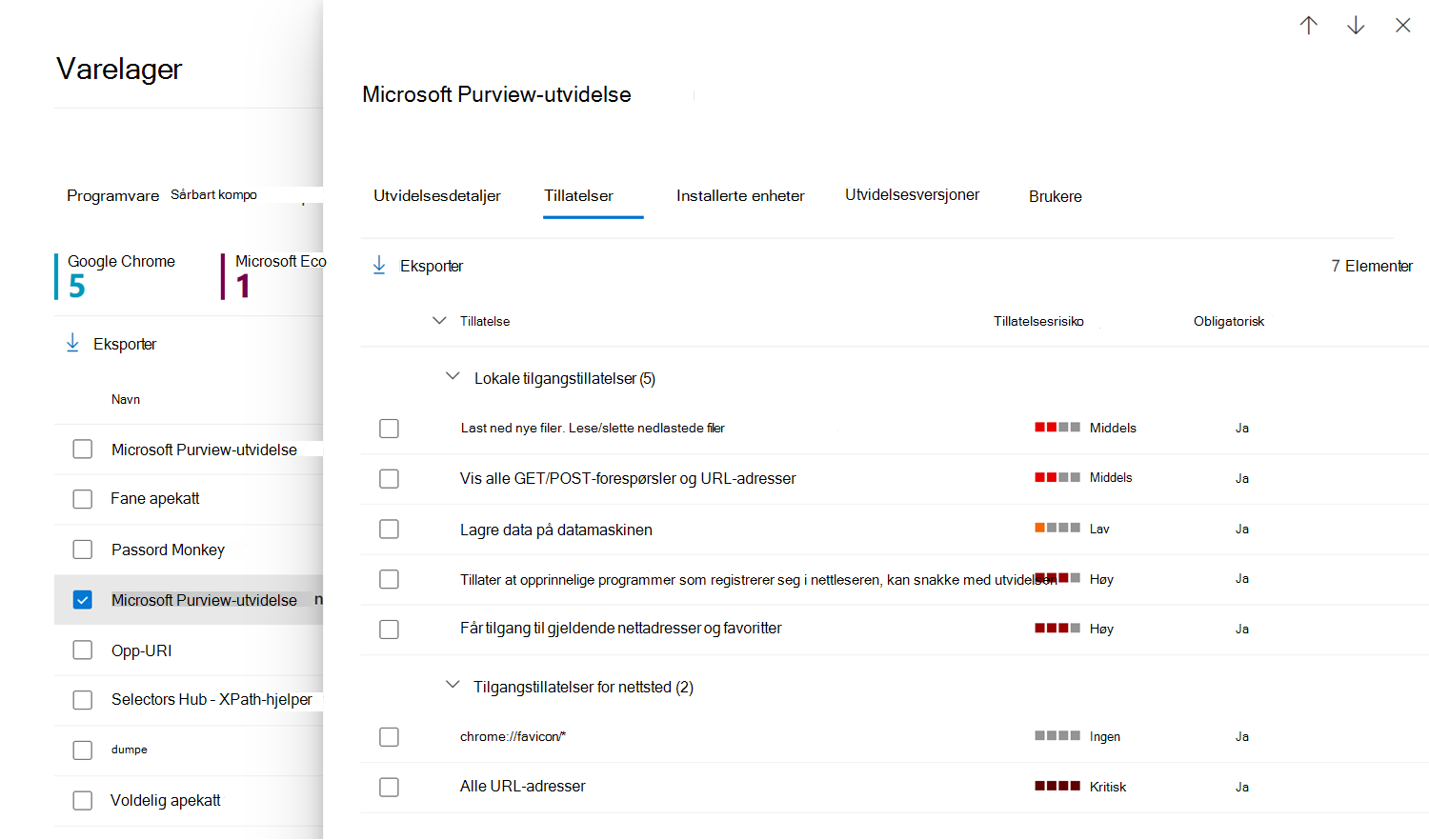 Kolonnene Forespørrte tillatelser og Tillatelser-risiko gir mer spesifikk informasjon om antall tillatelser som er forespurt av utvidelsen, og risikonivået for tillatelser basert på typen tilgang til enheter eller nettsteder den har bedt om.