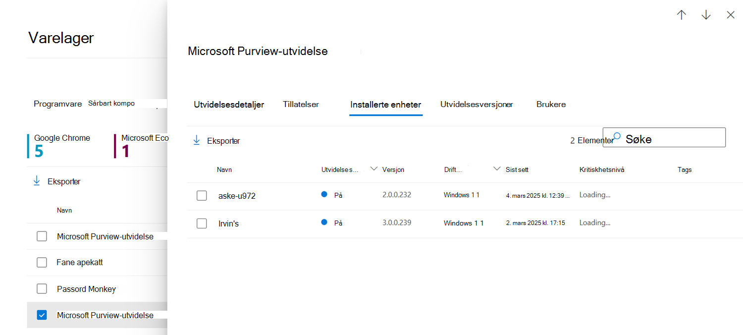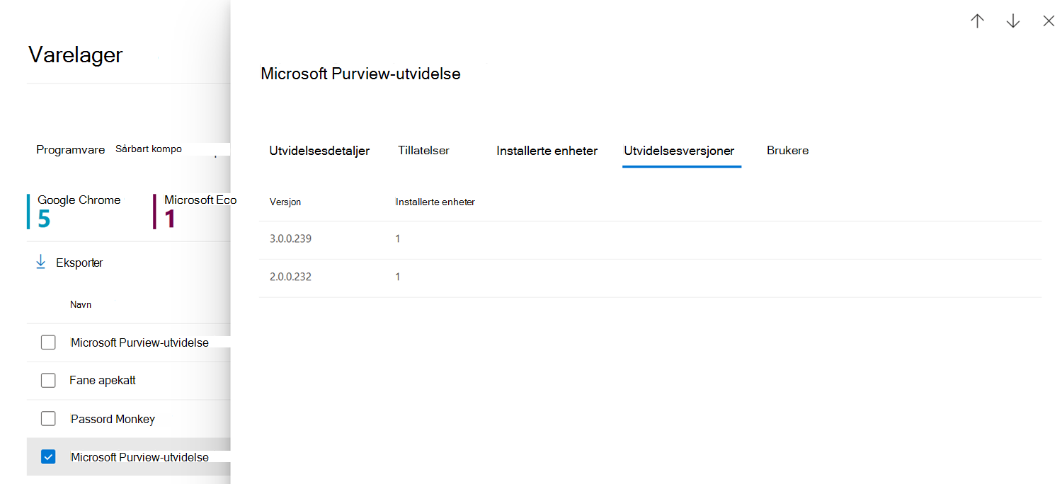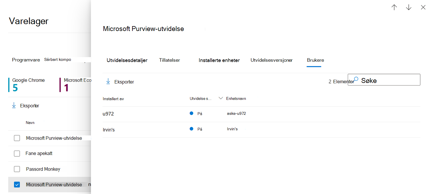 Siden for nettleserutvidelser viser en liste over nettleserutvidelser som er installert på tvers av ulike nettlesere i organisasjonen. Nettleserutvidelsesdetaljer samles inn på tvers av alle brukere som finnes i en bestemt nettleser. For hver installerte utvidelse, per nettleser, kan du se enhetene den er installert på, brukerne som installerte den, og om den er slått på eller av på en enhet.