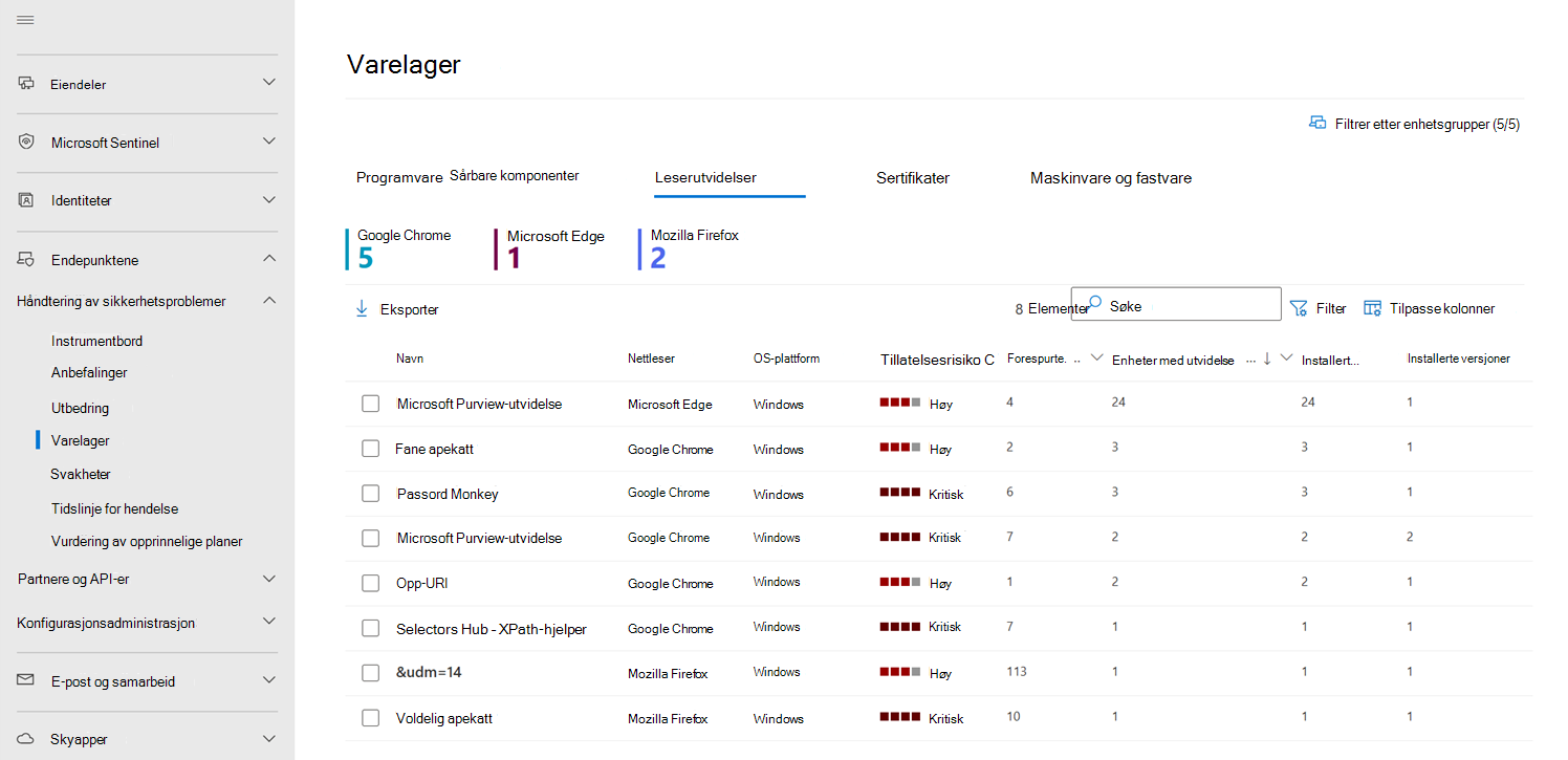 Vurdering av nettleserutvidelse er bare tilgjengelig på Windows-enheter. Bare utvidelser som finnes i Microsoft Edge, Chrome og Firefox, vises i listen over nettleserutvidelser.