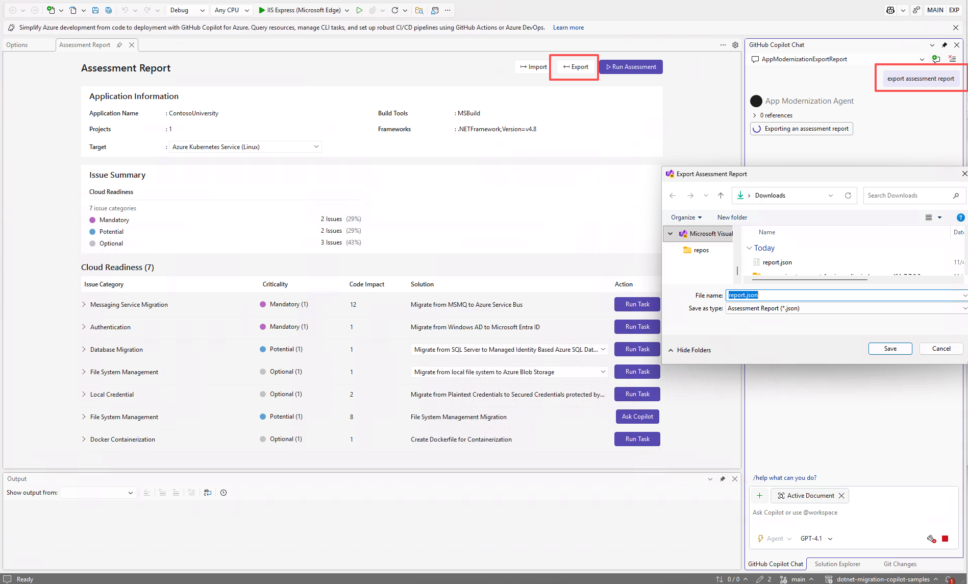 In the assessment dashboard, you can view the issues detected by AppCAT and choose the migration solution. You can export the report and share it with others. This way, other people don't need to run the assessment themselves and can import the report to view the assessment and migration decisions directly.